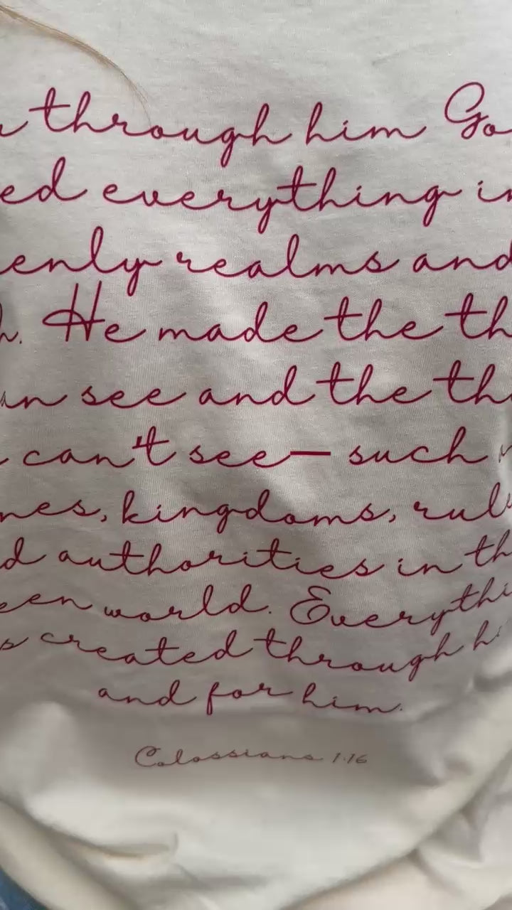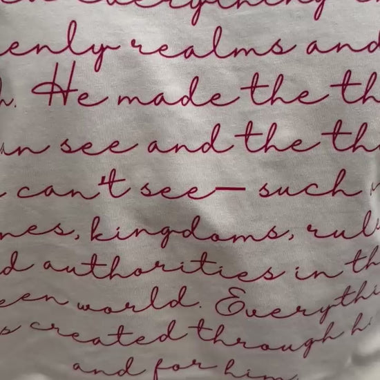 This ivory women's tee showcases "Heaven Made" across the chest in a striking pinkish-red cranberry hue. The back features Colossians 1:16 beautifully written in elegant cursive using the same rich color, blending faith with fashion. Crafted for comfort and style, this shirt lets you wear your beliefs proudly and gracefully every day.